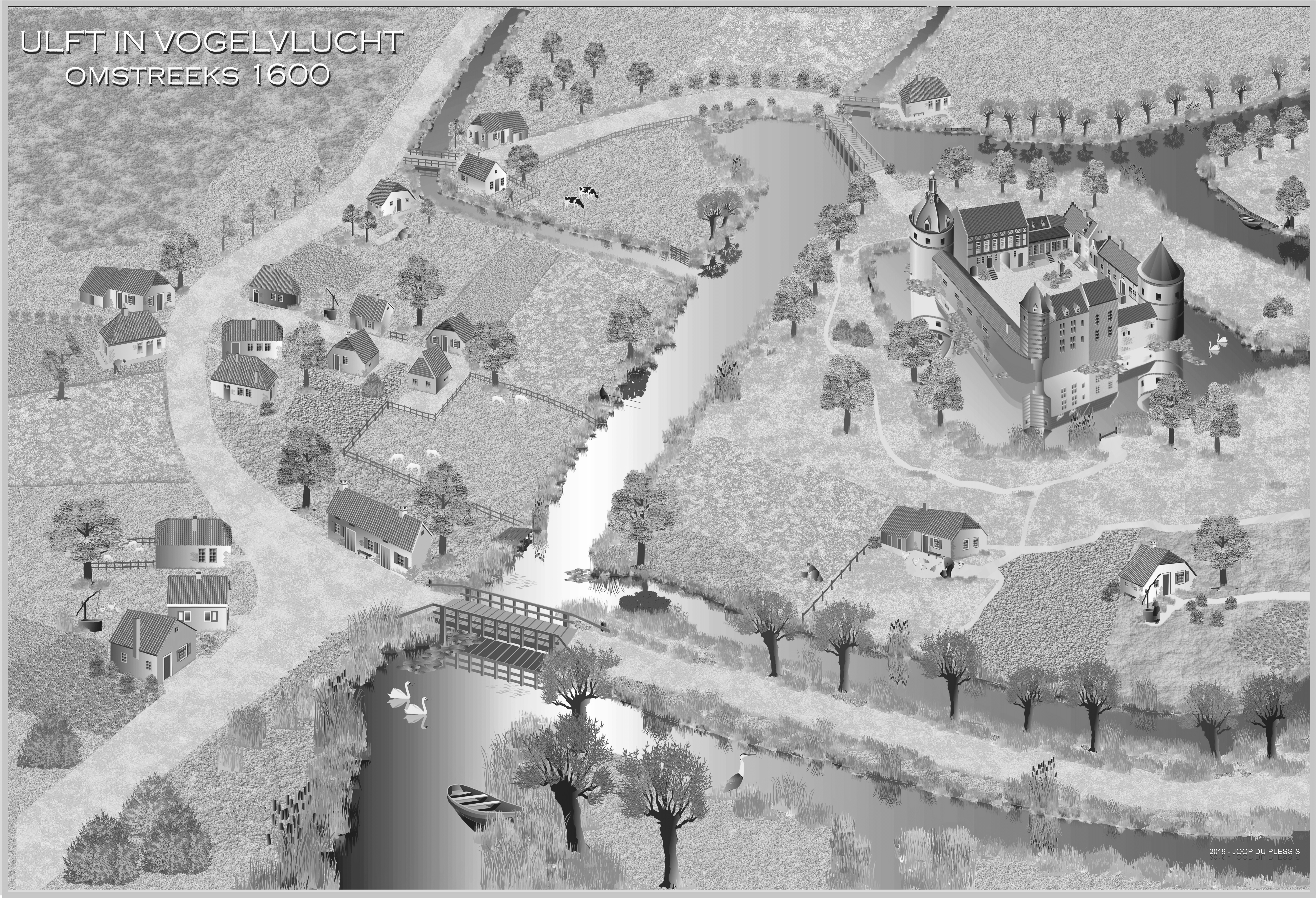 REALISTISCH ULFT IN VOGELVLUCHT omstreeks 1600-1650 met kasteel 'Ulft'